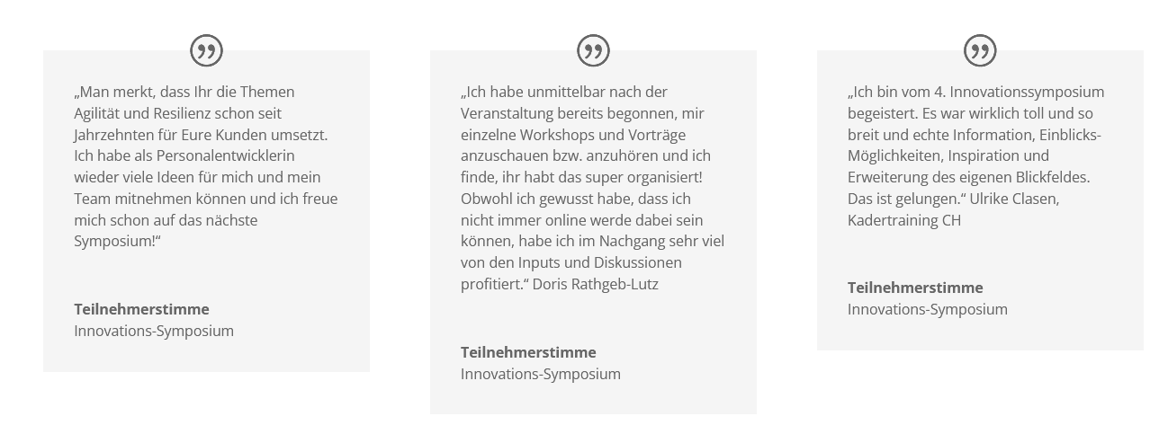 „Ein großes Kompliment und Dankeschön an das Team vom Resilienzforum Berlin! Das Innovationssymposium war eine rundherum gelungene, inspirierende Veranstaltung. Selten habe ich in kurzer Zeit so viele wertvolle Anregungen erhalten! Zahlreiche erlebbare Tools, fundierte und kurzweilige Vorträge, heiteres Ausprobieren und Reflektieren, kompetente ReferentInnen und interessante Gespräche mit den anderen Teilnehmern – und das alles in einer ungewöhnlichen Location. Ich hoffe sehr, dass ich das nächste Mal wieder dabei sein kann!“