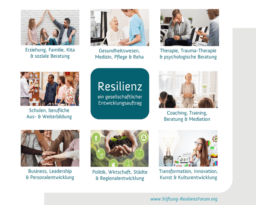 Wir bilden Multiplikatoren aus acht verschiedenen Anwendungsfeldern der Resilienz aus, von der Pflege, über die Erwachsenenbildung bis zur Regionalentwicklung. Neben unseren offenen Ausbildungsgruppen entwickeln wir individuelle Angebote für Akademien und Inhouse-Weiterbildungen.